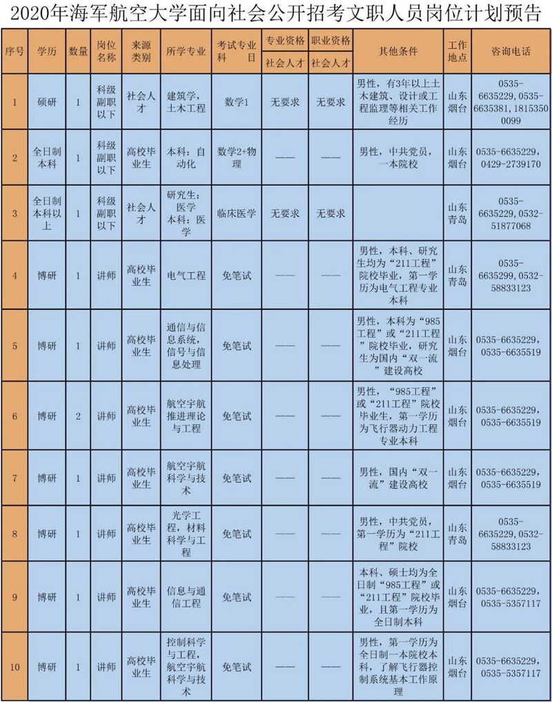 1.公布招考信息軍委政治工作部通過軍隊人才網,向社會公開發布2020年度軍隊文職人員統一招聘信息。海軍航空大學微信公眾號(微信號:PLA_hjhd)同步發布。