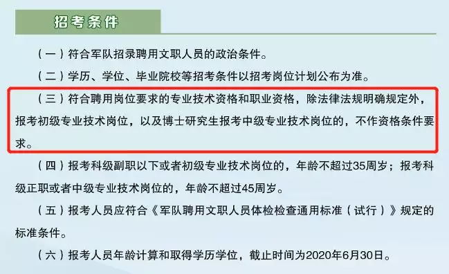2020年軍隊文職招考預公告中對招考條件有所規定:報考人員需符合聘用崗位要求的專業技術資格和職業資格。