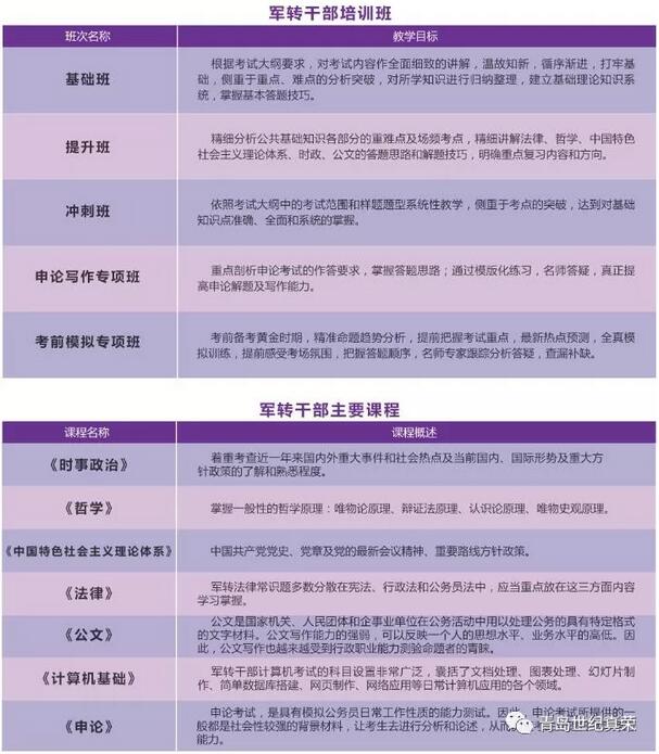 學習內容上,依據山東省軍轉考試大綱和歷年真題而設置,開設《時事政治》《哲學》《中國特色社會主義理論》《申論》《法律》《公文》《計算機基礎》6門主要課程,涵蓋軍轉考試大綱要求的全部知識點;班型班次上,區分基礎班、提升班、沖刺班、《申論》寫作專項班、考前模擬專項班,這5個班次內容設置綜合系統,相互關聯,循序漸進,環環緊扣,確保從容備考。