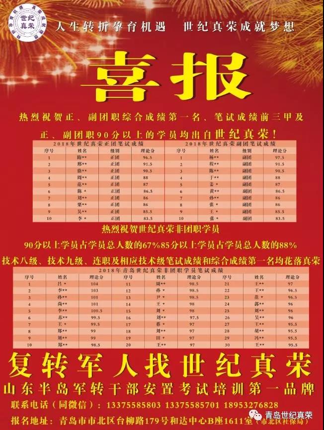 近年來,世紀真榮憑著樂業敬業、專心專注的精神,積累了豐富的經驗、樹立了良好的形象,軍轉干部考試歷年培訓人數和高分通過人數均名列青島市前茅并處于山東省主導地位,在廣大軍轉干部中口碑甚好。2017年軍轉安置培訓考試,培訓人數、高分通過人數蟬聯山東半島第一,取得了青島市當年非團職筆試成績第一名、正團職前十名的優異成績;2018年,正、副團職筆試成績90分以上的學員均出自世紀真榮,取得了正、副團職學員綜合成績第一名、筆試成績前三名,技術八、九級和連職(含對應技術級)綜合成績、筆試成績均第一名的好成績,并囊括正團職前二十五名、副團職前四十名。