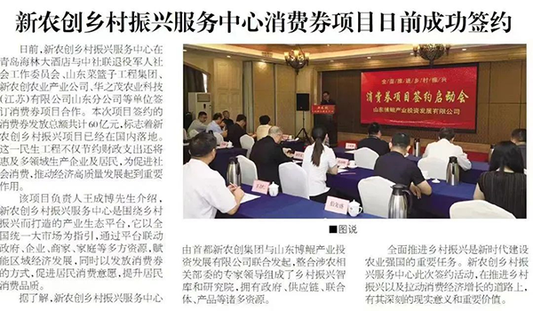 8月8日,新農創鄉村振興服務中心在青島與中社聯退役軍人社會工作委員會、山東省菜籃子工程集團、新農創農業產業公司、華之茂農業科技(江蘇)有限公司山東分公司等單位簽訂消費券項目合作。青島世紀真榮人才作為中社聯會員單位代表協會參加此次啟動會。本次項目簽約的消費券發放總額共計60億元,標志著新農創鄉村振興項目已經在國內落地。這一民生工程不僅節約財政支出還將惠及多領域生產企業及居民,為促進社會消費,推動經濟高質量發展起到重要作用。