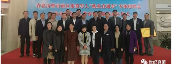 世紀真榮董事長張榮真參加在退役軍人事務局舉行的由青島市退役軍人事務局主辦、市南區退役軍人事務局承辦的青島市暨市南區退役軍人“就業直通車”專場招聘會、青島市退役軍人教育培訓聯盟成立儀式。